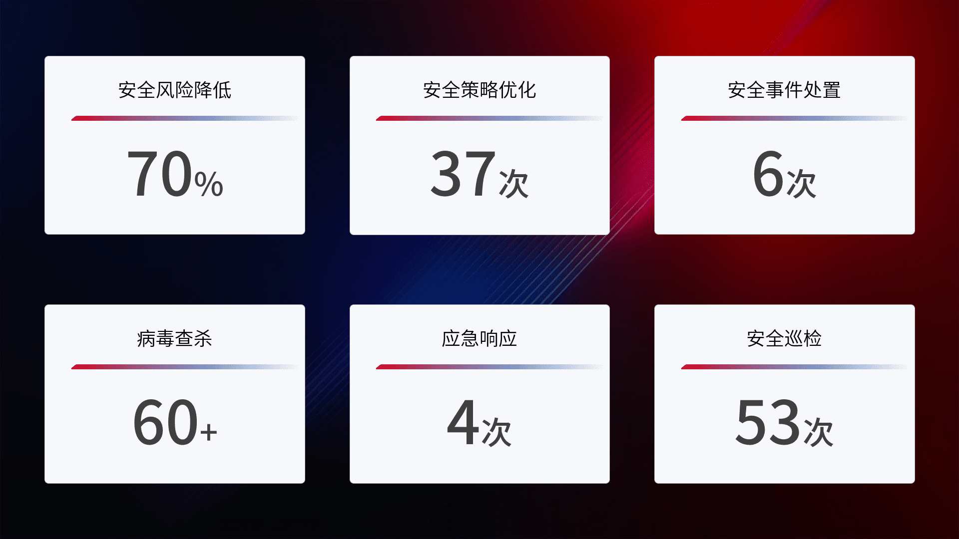 提供全面的安全事件报告体系,,,包括处置报告、、、周报、、、、季度和年度总结,,结合持续监控,,帮助客户深入了解网络安全状况。。。