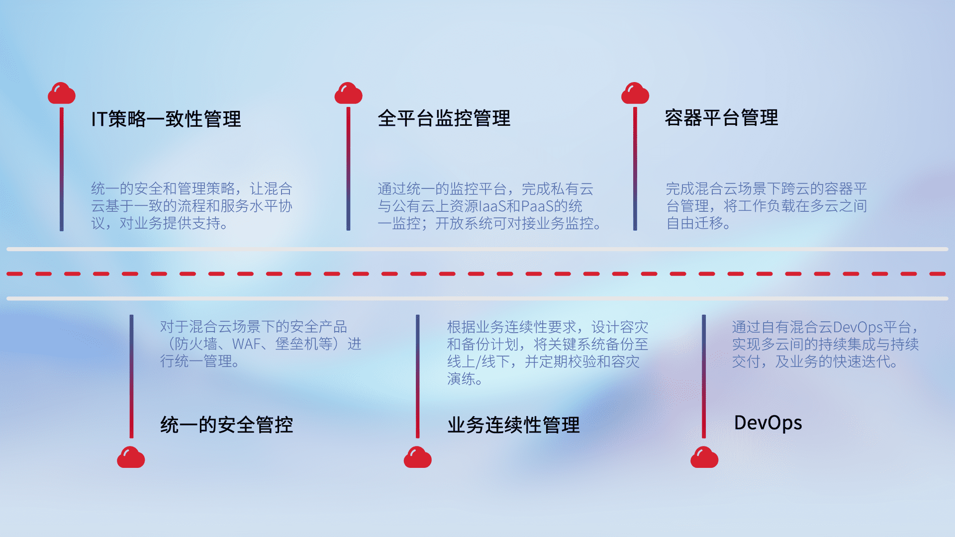 通过多云纳管,,,以统一的资源数据模型把客户的云资源进行抽象和封装,,,,进而实现对多云资源的统一操作,,,保障云资源管理的可靠性、、、稳定性与可用性。。量身定制化运维内容,,,,配置、、、开发运维、、补丁管理、、、、备份、、、、监控、、、认证和访问管理、、、审计和日常巡检等,,保障在用云过程中的可靠度,,,稳定度以及高可用率。。。。