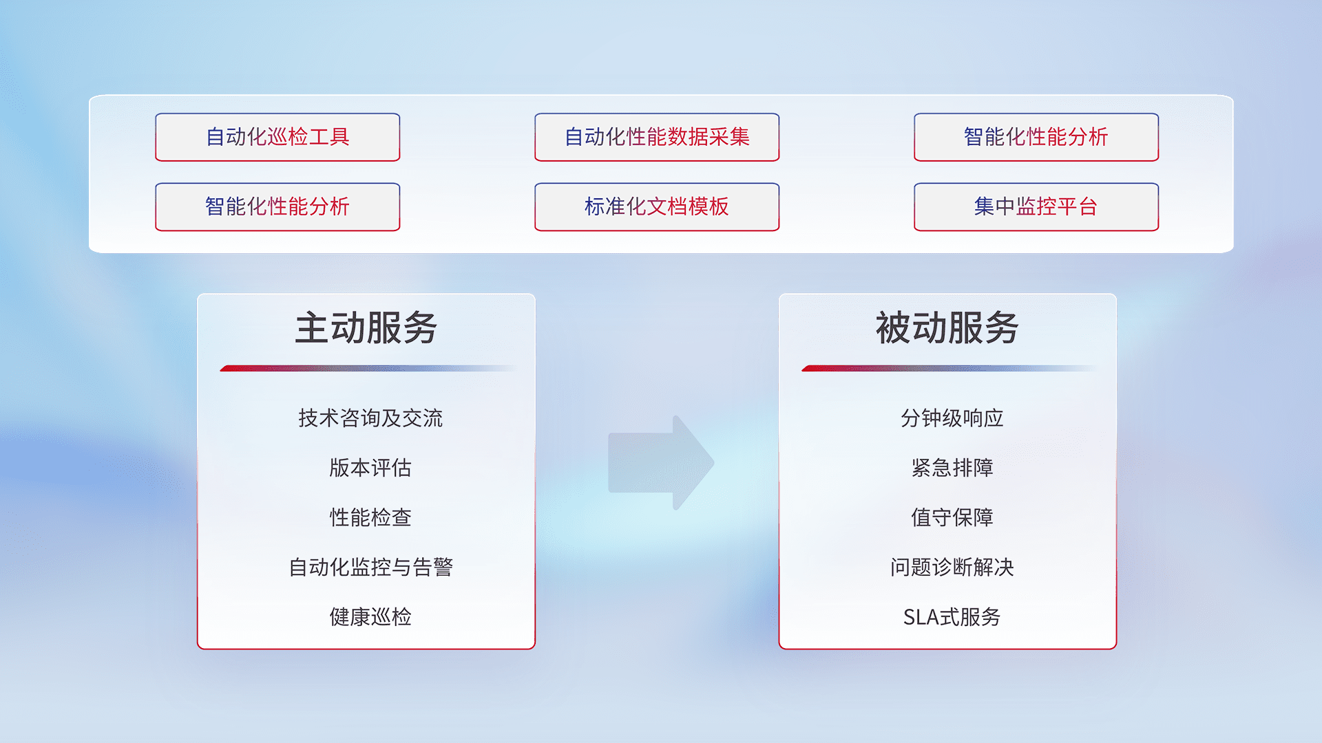 智能化工具和标准化文档,,,保障服务质量,,,提供主动服务(包含技术咨询、、、版本评估、、、、性能检查、、自动化监控与告警、、健康巡检)和被动服务包含(分钟级响应、、、紧急排障、、、、值守保障、、、、问题诊断解决、、、、SLA服务)。。。。